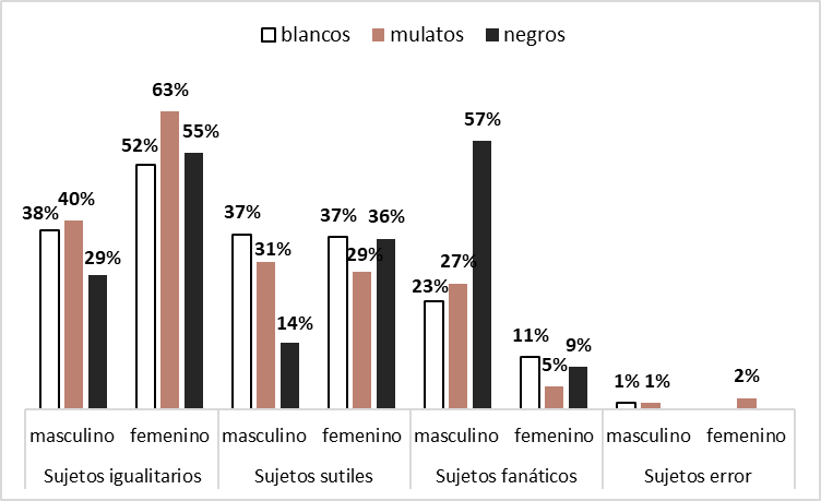 Por otro lado, en relación con el grupo racial, se detectó una disparidad notable, en especial entre los sujetos clasificados como igualitarios. En este grupo, más de la mitad de los participantes de piel mulata se incluyeron en esta categorización, lo que sugiere una tendencia particularmente destacada hacia actitudes igualitarias entre los individuos mulatos.