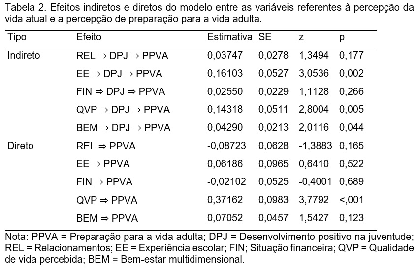 Os resul­ta­dos ref­er­entes à hipótese esta­b­ele­ci­da foram par­cial­mente con­fir­ma­dos, pois o DPJ fun­cio­nou como medi­ador de três var­iáveis (exper­iên­cia esco­lar, qual­i­dade de vida e bem-estar mul­ti­di­men­sion­al) e PPVA. No que tange ao efeito dire­to sobre PPVA, somente a var­iáv­el qual­i­dade de vida foi preditora.